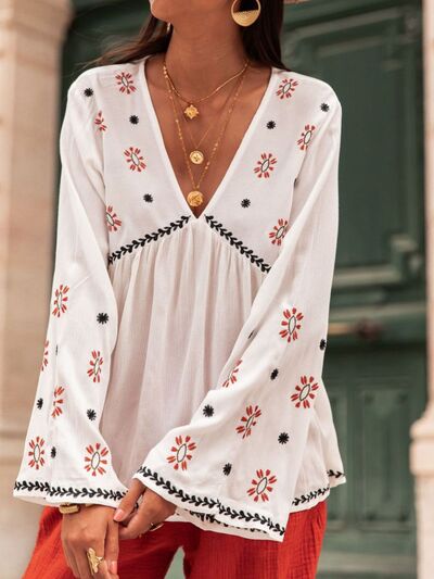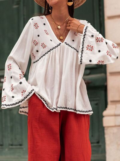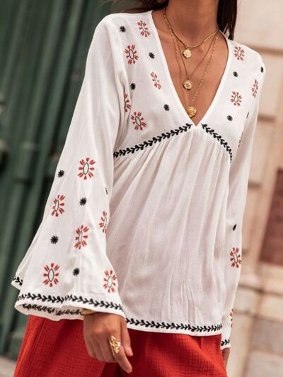 Embroidered V-Neck Long Sleeve Blouse
